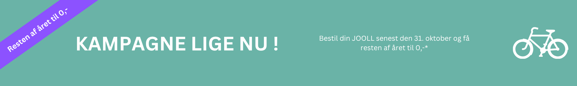 *Alle selvstændige, arbejdspladser og deres medarbejdere kan drage fordel af denne kampagne i Danmark. Uanset om det er til en, flere eller til alle medarbejdere eller antal bestillinger. Gælder nye bestillinger fra 01.10.2025 – Bestillingen skal placeres på JOOLL.dk eller via partner butik senest den 31.10.2025. Når ordren er afgivet, vil JOOLLs bookingteam bekræfte, at resten af året er til 0 kroner af JOOLL perioden. Denne kampagne gælder ikke modellerne fra mærker Batavus, Koga, Cowboy, BBbcargo & Sparta. Kampagnen kan ikke kombineres med andre tilbud fra JOOLL. (Bookingteamet tjekker, om medarbejderen og arbejdspladsen kan bruge opstartskampagnen i overensstemmelse med generelle betingelser)